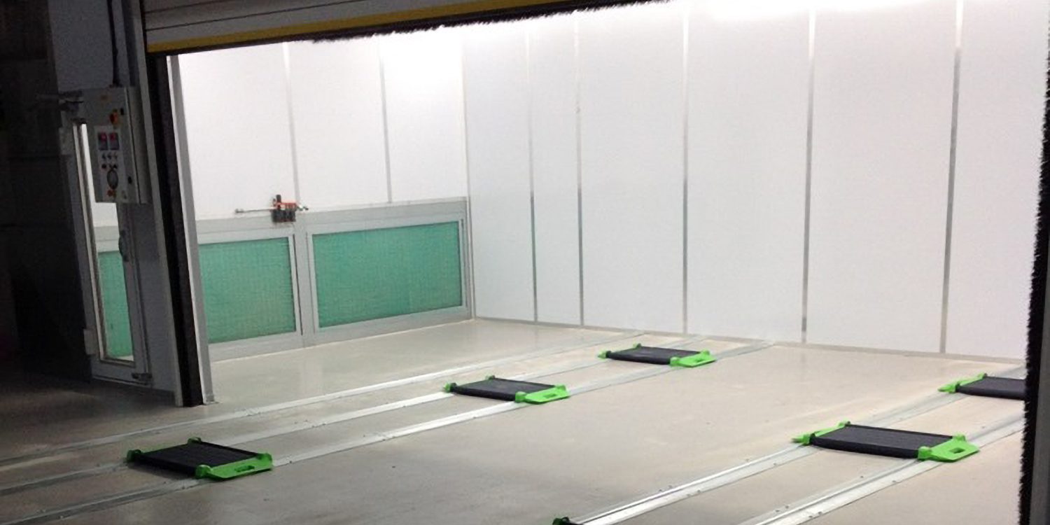 There are two kinds of tracks according to the installation position and mode: In-floor track and On-floor track. In-floor track is constructed from a metal section with a specific design and is installed inside the floor level. They can also be installed inside the grid of the spray booth and the preparation bay; On-floor track is also constructed from a metal section with a specific design and are easily installed on the floor and secured with expansion bolts, there are gentle slopes on both sides of the track, which will not affect the passing of wheels and pedestrians.