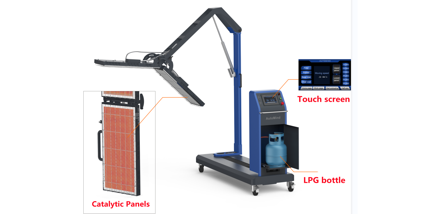 AM30 RunnerDry Mobile Catalytic IR Dryer is ideal for drying complete panel. It adopts advanced catalytic technology, using natural gas and LPG as its power. It has two catalytic IR emitting panels, which can cover the whole panel through automatic movement. Dry clear coat in as little as 4-5mins, efficiency is 5 times quicker than traditional drying. With the mobile catalytic IR Dryer, the use frequency of the spray booth is greatly reduced, which not only improves the working effificiency massively, but also has signifificantly less energy cost.